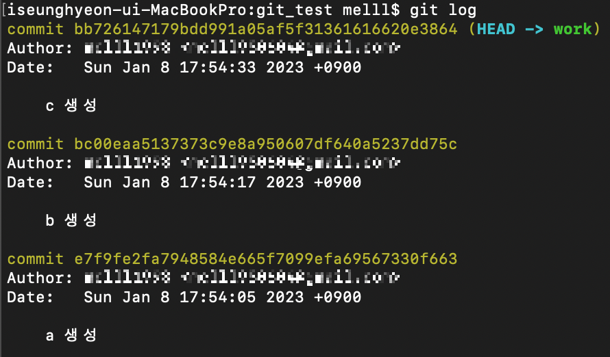 여러 옵션을 사용해보기 위해 work 브랜치에서 3개의 커밋을 생성했다.