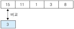 ① 첫 번째 데이터인 15와 찾고자 하는 3이 같은지 비교하는데, 다르므로 다음으로 이동한다.